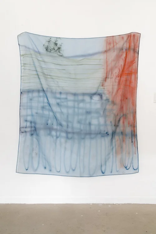 After a 13 month studio residency in Hamburg Germany at Frappant .eV Barnet stages an experimental painting installation. Collage, paint and drawing techniques are used to navigate how the body and personhood connect to space and movement and the flow of the contemporary era. Barnett is interested in the space that individuals inhabit within this constant change and the parallel between the concept of water and the human condition. Individuals, like water, are in constant flux and states of transition, always the same but always different, drifting in the never ending stream of time. Barnett's expanded approach to painting attempts to open opportunity within the limitations of painting. Materials layer in space and lead to unfolding possibilities.